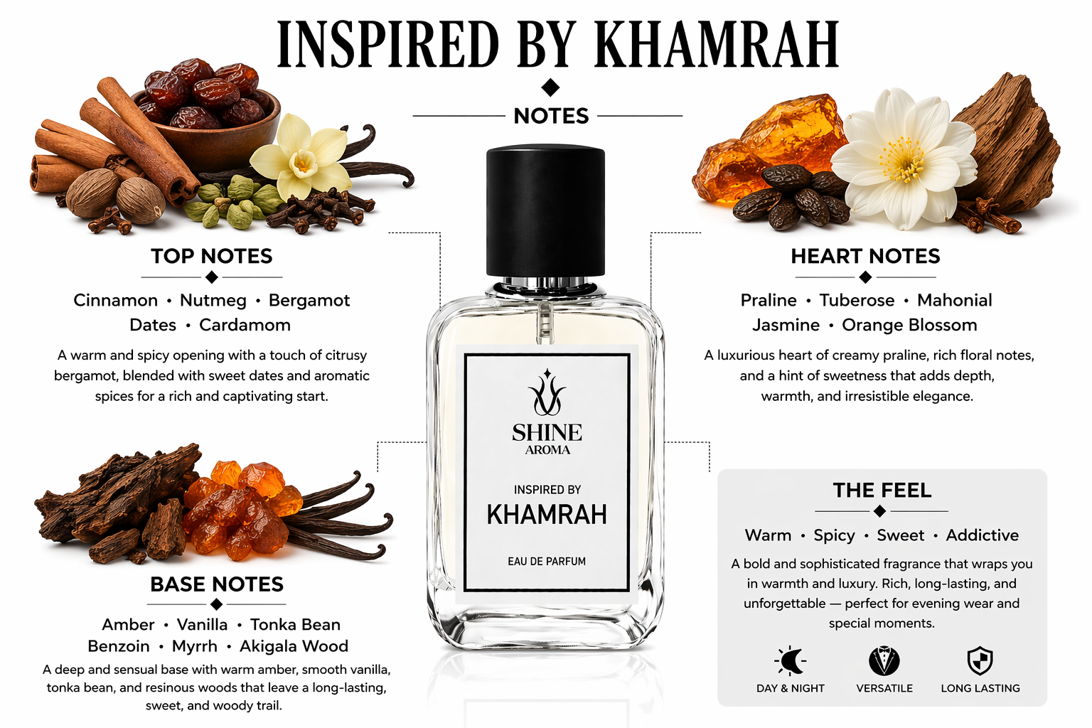 The base of a Khamrah-inspired fragrance typically consists of a warm and sensual blend of vanilla, amber, and possibly oud or other woody elements. Vanilla provides a creamy and comforting sweetness, while amber adds a touch of warmth and richness. The oud or other woody notes provide depth and longevity, creating a long-lasting and memorable scent. The combination of these elements results in a fragrance that is both comforting and sophisticated, making it suitable for various occasions, especially during the cooler months.